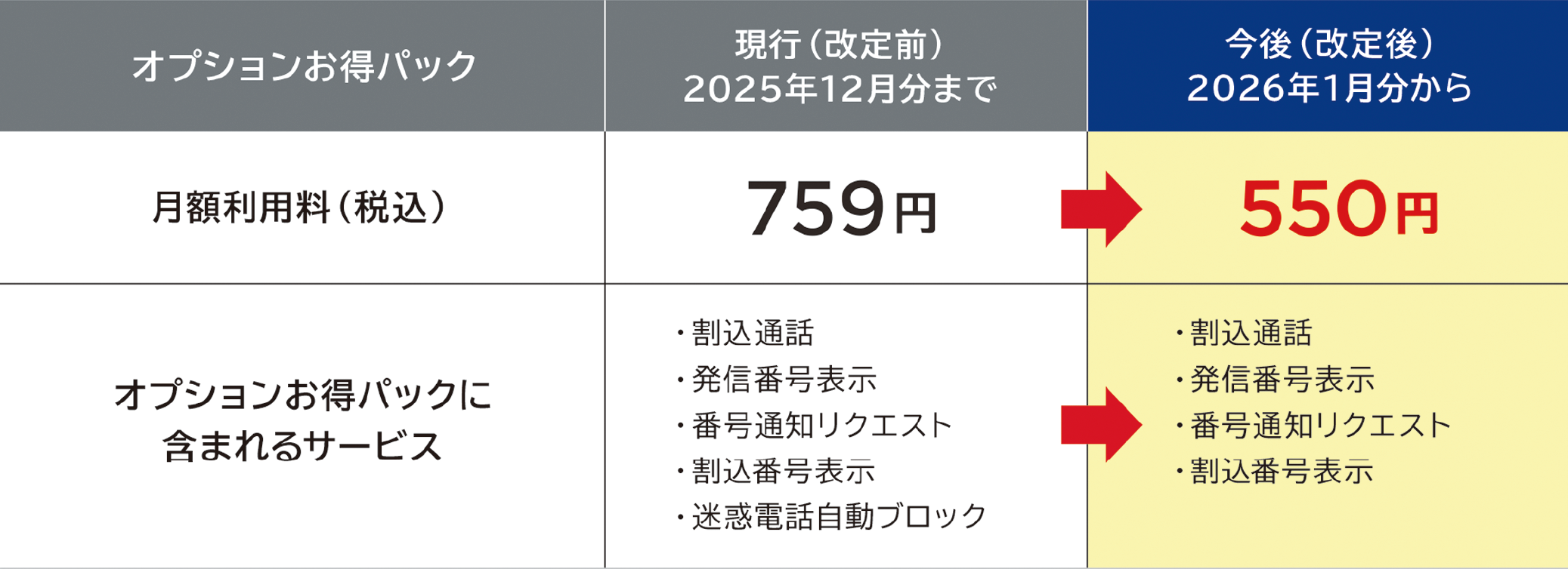 ■迷惑電話自動ブロックの月額利用料の無料化に伴い、オプションお得パックのサービス内容・月額利用料も改定いたします。