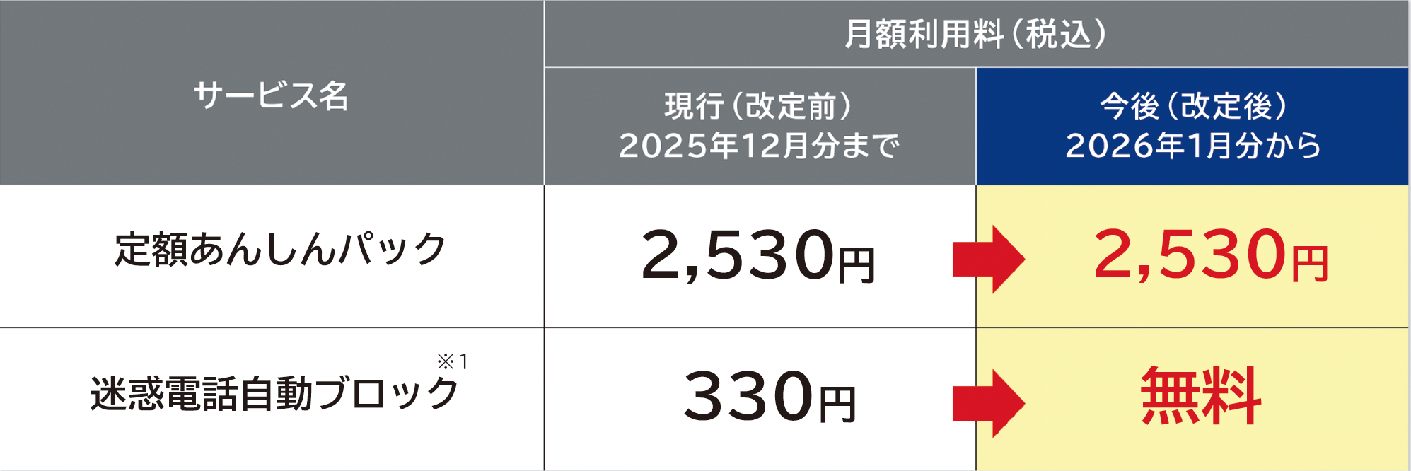 ■定額あんしんパックご利用のお客さまについては、月額基本料(2,530円)の変更はございません。迷惑電話自動ブロックが無料でご利用いただけます。