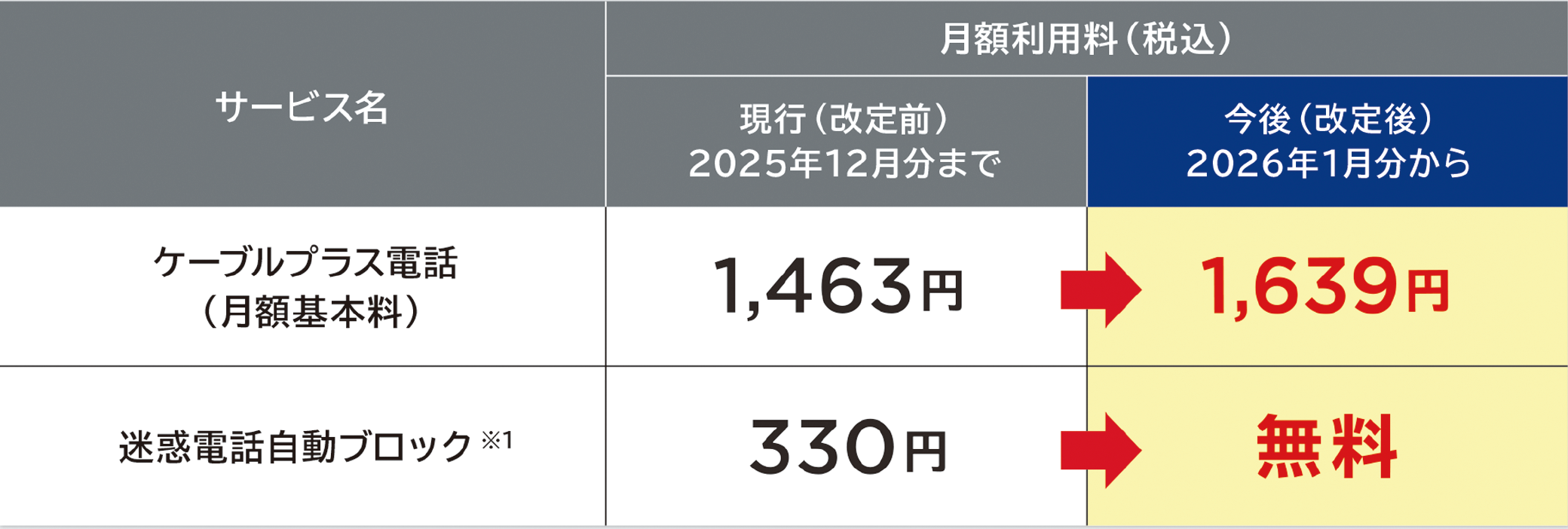 2026年1月1日より、ケーブルプラス電話のサービス提供元であるJCOM株式会社による改定に基づき、ケーブルプラス電話および迷惑電話自動ブロックオプションの月額利用料とサービス内容の改定をお知らせいたします。